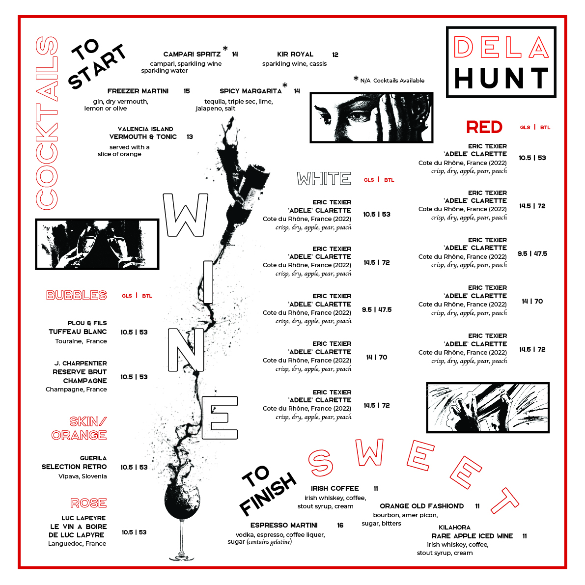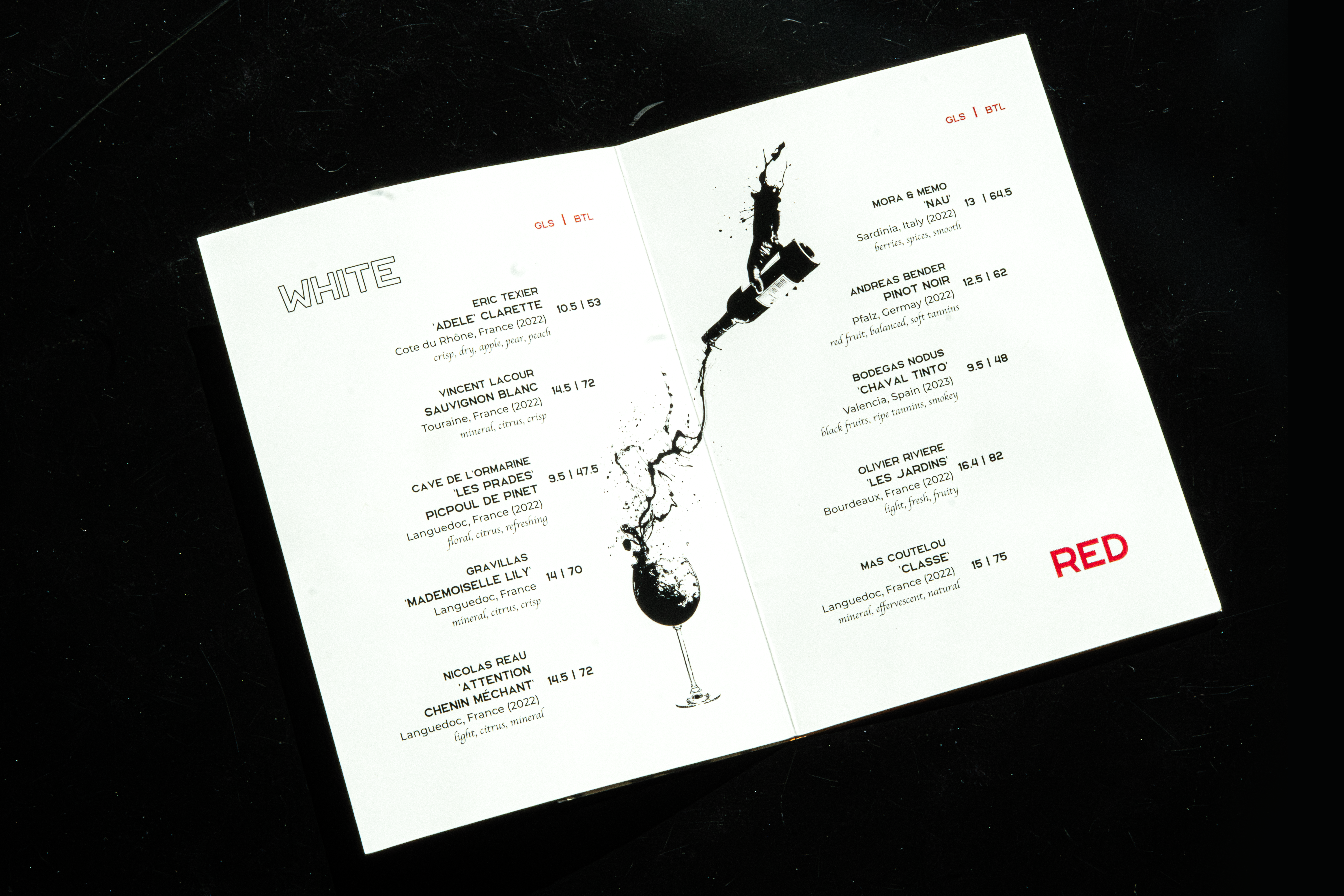 The brief was to reimagine the cocktails menu, updating the restaurant’s classic identity with a contemporary design language that reflects both its literary heritage and the cinematic atmosphere of its bar. The visual approach fuses the timeless, understated elegance of Delahunt with the bold graphic aesthetic of Frank Miller’s Sin City.