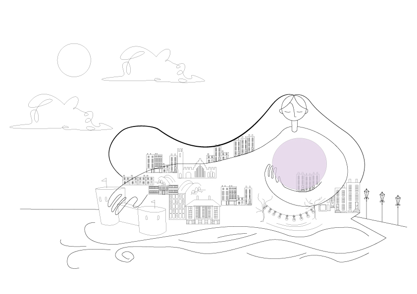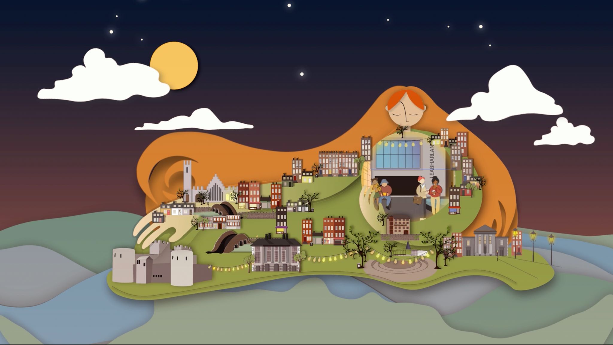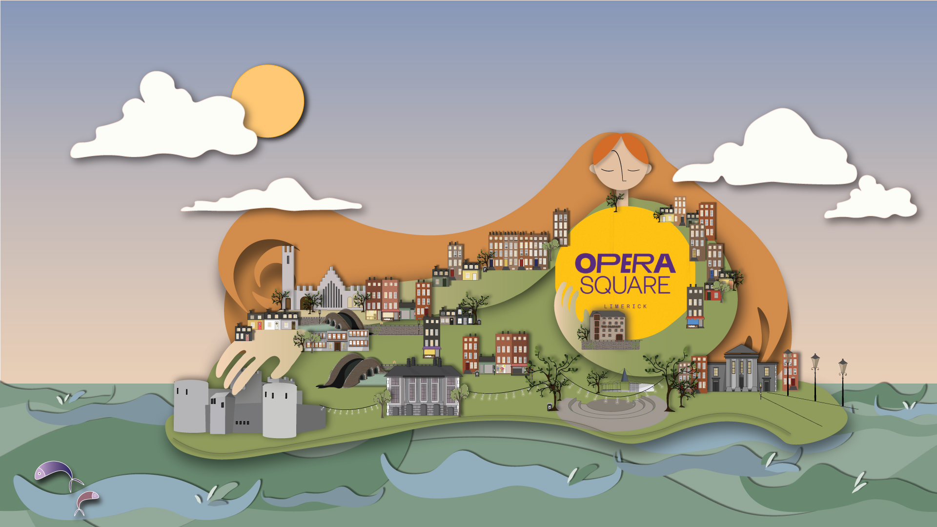 Our final concept personifies Limerick as a nurturing figure drawn from the beloved song “Limerick You’re a Lady,” with Opera Square envisioned as the city’s symbolic beating heart. The visual language blends digital papercut techniques, pop-up book aesthetics, and classic tourism poster influences to create a layered, accessible, and story-driven artwork.