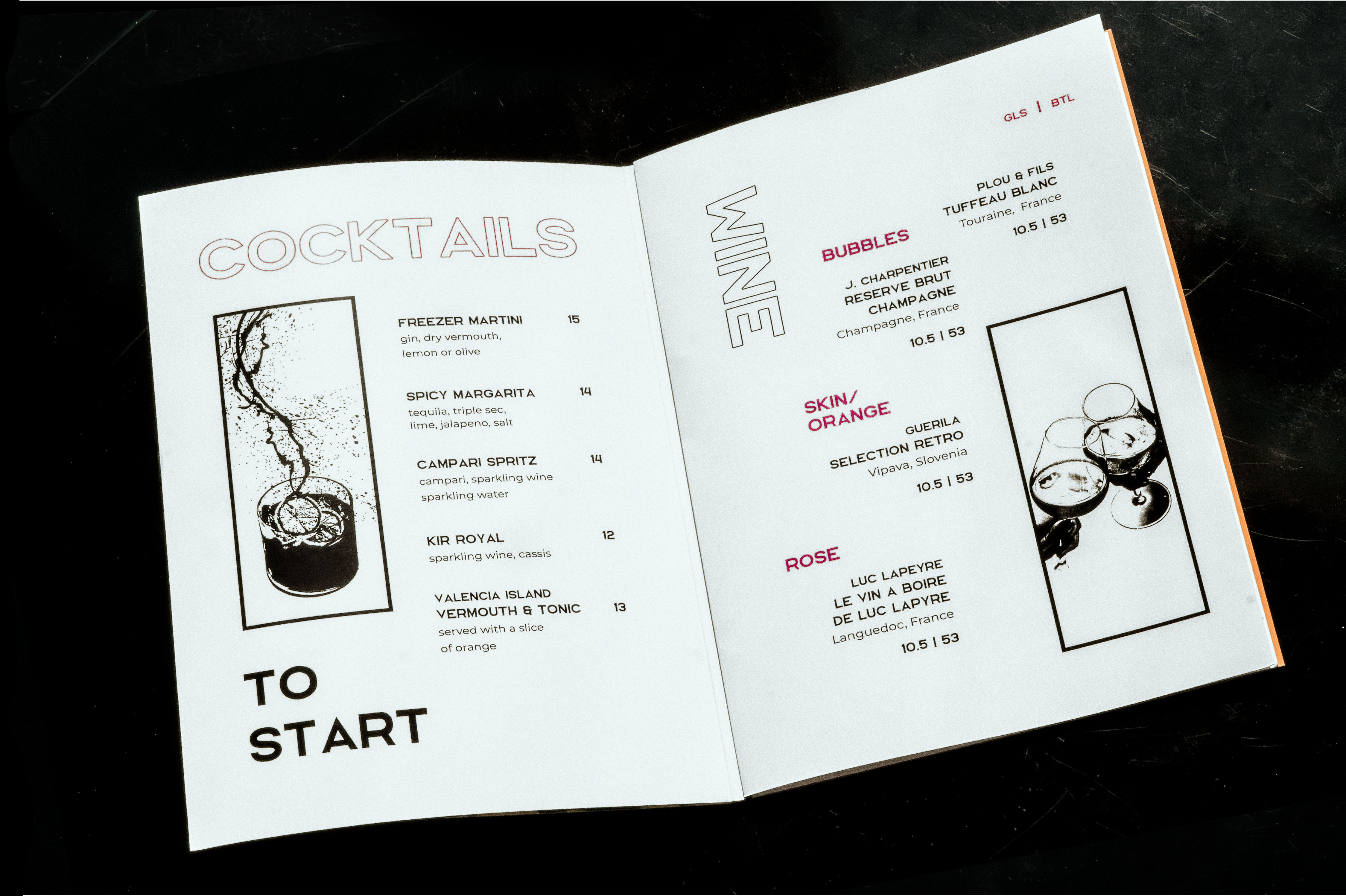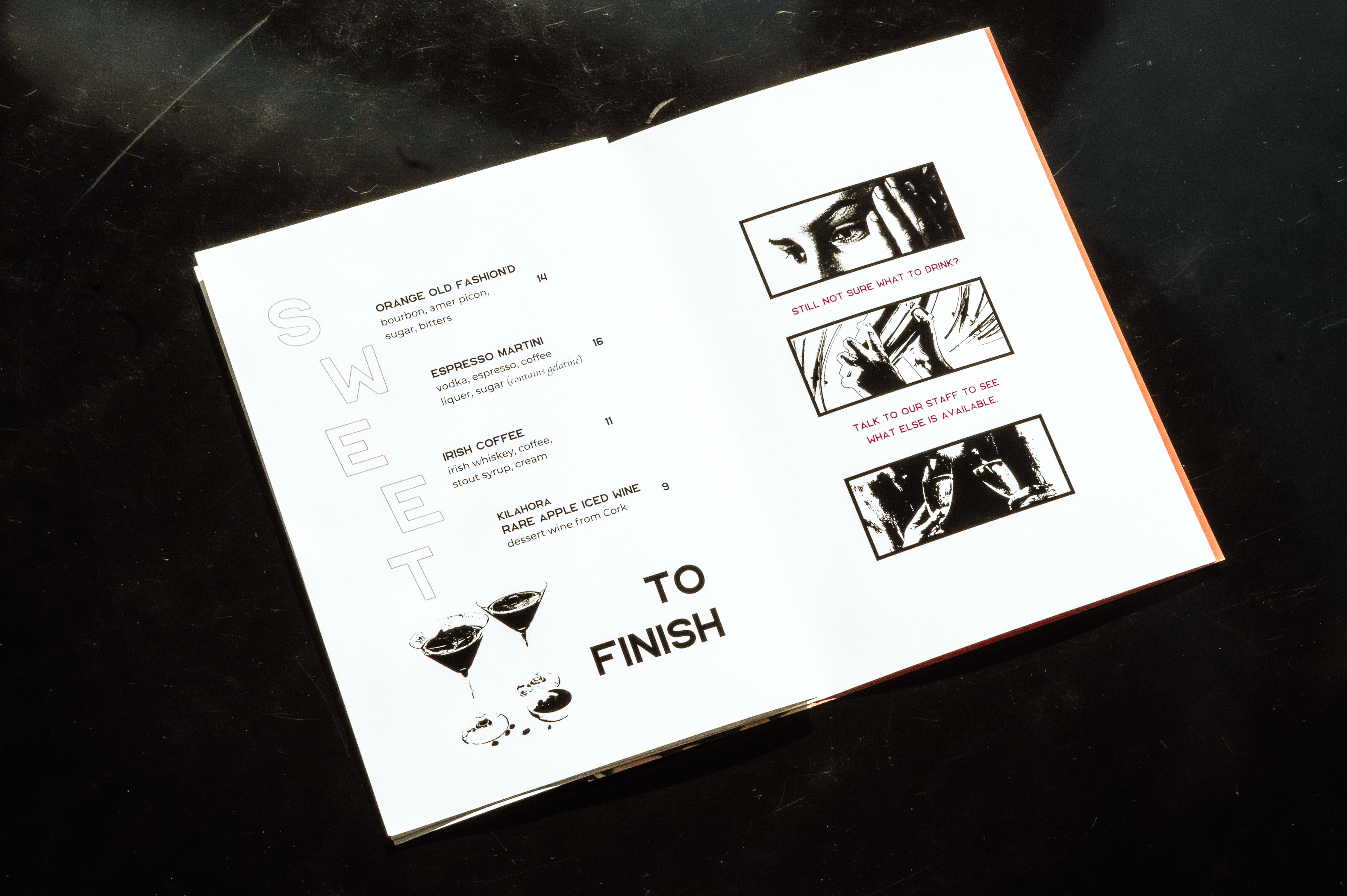 The brief was to reimagine the cocktails menu, updating the restaurant’s classic identity with a contemporary design language that reflects both its literary heritage and the cinematic atmosphere of its bar. The visual approach fuses the timeless, understated elegance of Delahunt with the bold graphic aesthetic of Frank Miller’s Sin City.